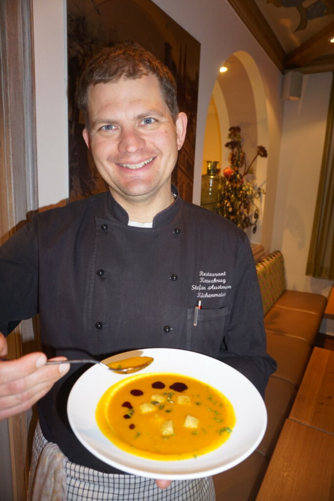 Noch ein Beweis gefällig, wie abwechslungsreich eine einzelne Zutat sein kann? „Mein liebstes Wintergemüse ist der Kürbis“, verrät Stefan Austmann vom Kreuzkrug. „Am besten der Hokkaido. Er wird bei uns vielseitig eingesetzt, zum Beispiel als Beilage oder als Ergänzung im herbstlichen Gemüse, in oder als Nudeln, Kürbissuppe oder auch eine Kürbiskruste mit gerösteten Kürbiskernen und leichter Currynote zum Überbacken von Fleisch, Fisch oder Wildgerichten.“